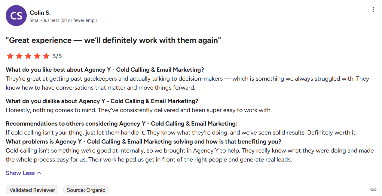 The leads, coupled with the valuable market data, provided significant insight for the client. So much so that they requested that we do it again! Were currently working on Phase 2 of the project, which includes reaching out to our client's prospects in other states where the company has a presence. Ultimately, through our improved cold calling methods and detailed market data, we hope to increase sales and create a more effective way for companies to touch their audiences!